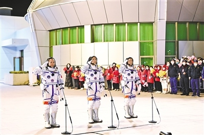 據(jù)中國載人航天工程辦公室消息,11月29日20時(shí)18分,神舟十五號(hào)載人飛行任務(wù)航天員乘組出征儀式在酒泉衛(wèi)星發(fā)射中心問天閣圓夢園廣場舉行。航天員費(fèi)俊龍(中)、鄧清明(右)、張陸在出征儀式上。汪江波攝