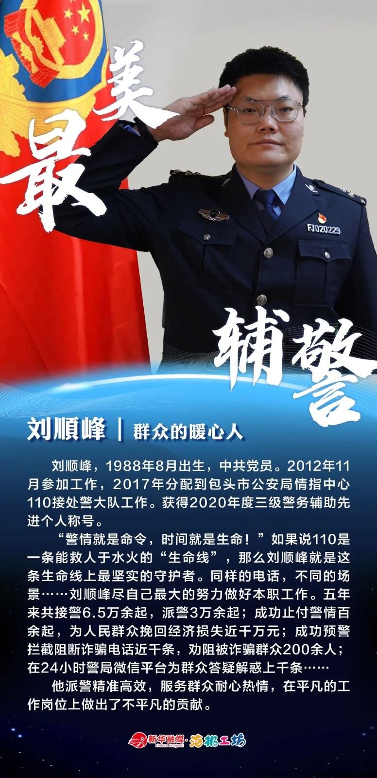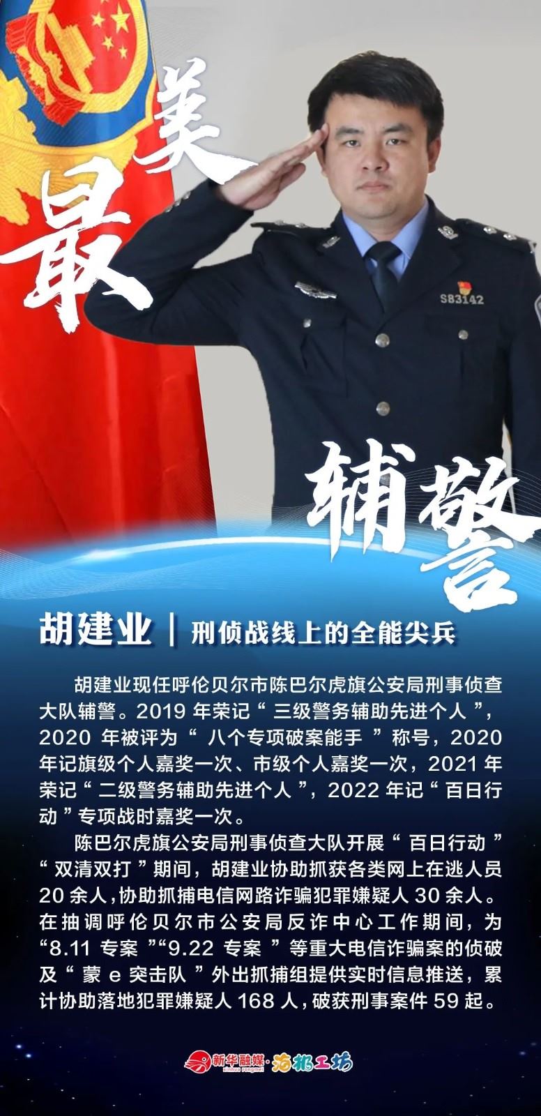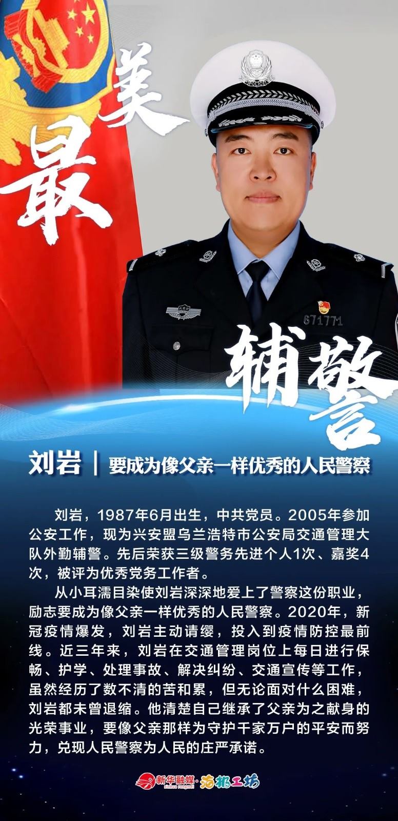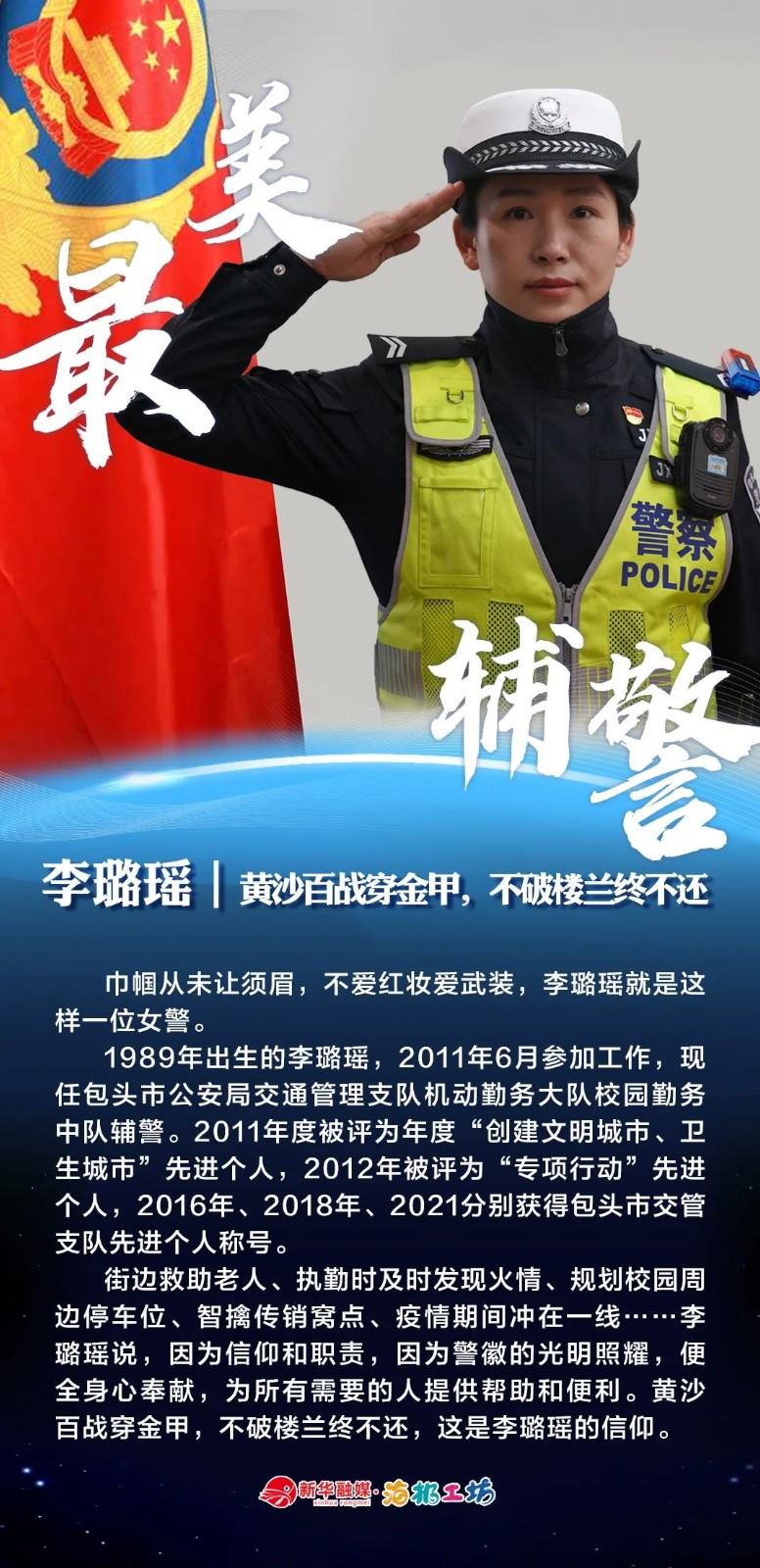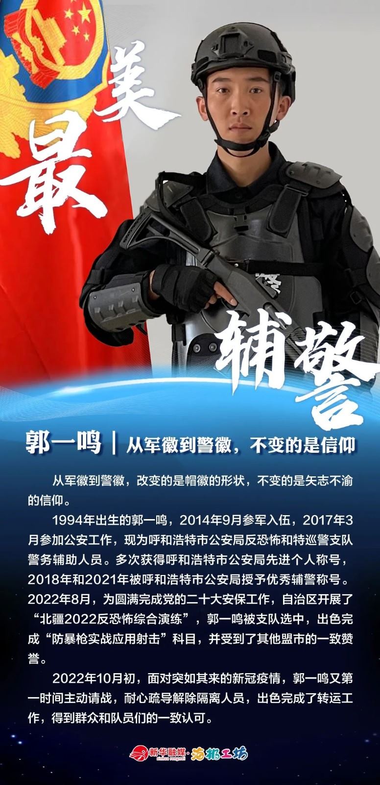 “不同的肩章,同樣的堅守……”在“感動北疆·最美輔警”獲獎?wù)咧校?strong>有堅守忠誠的安全衛(wèi)士郭一鳴,對癥下藥的老片兒警康華,服務(wù)群眾的熱心人辛永紅,校園安全的“護(hù)航員”李璐瑤,社區(qū)警務(wù)“信息化管家”鄭威,警務(wù)支撐“小能手”胡建業(yè),110接處警“活地圖”劉順峰,網(wǎng)上巡查“質(zhì)檢員”王昊,基層交通安全“好聲音”劉巖,一線“智慧公安”排頭兵張?zhí)睢?/strong>