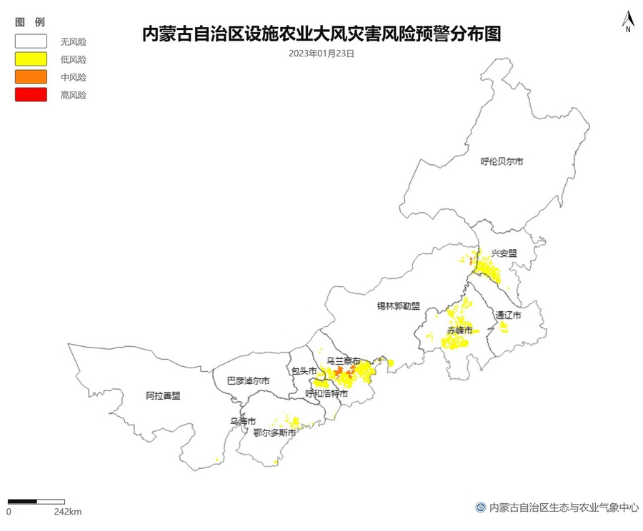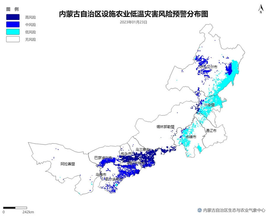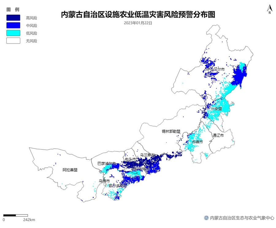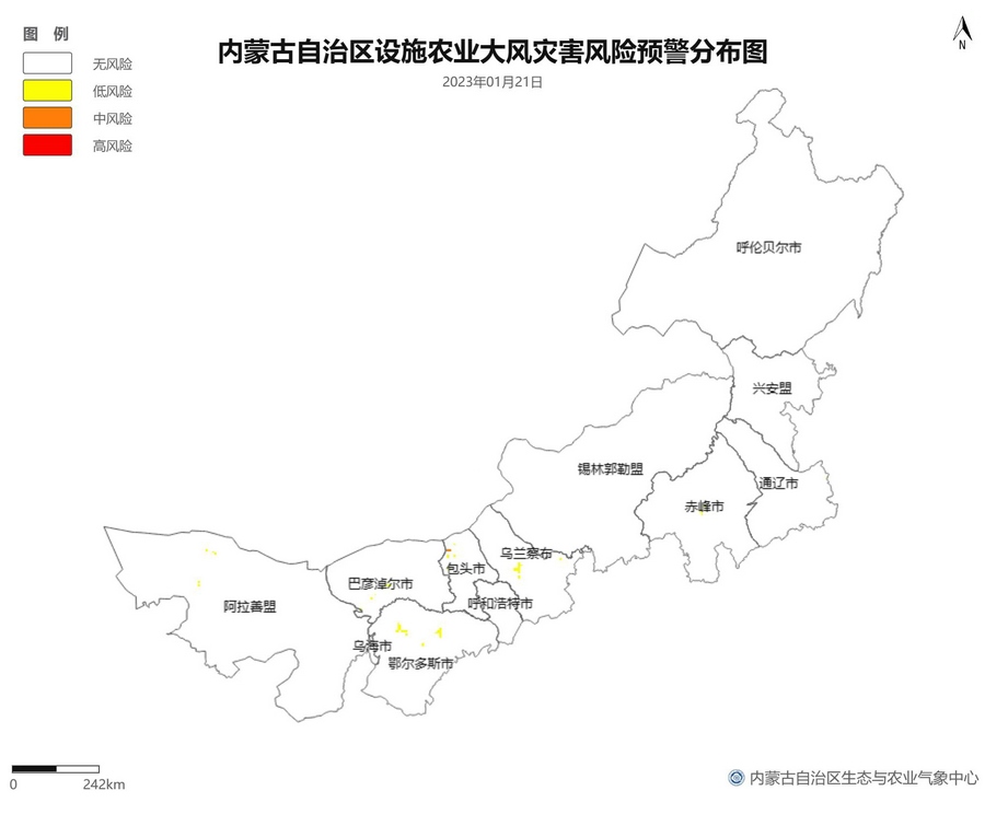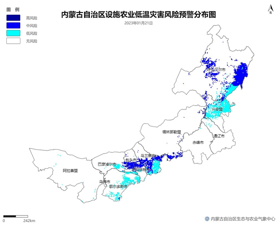 根據(jù)智能網(wǎng)格預(yù)報(bào)數(shù)據(jù),結(jié)合設(shè)施農(nóng)業(yè)低溫災(zāi)害和風(fēng)災(zāi)指標(biāo),1月21日至23日,呼倫貝爾市東南部、東南部偏西地區(qū)為設(shè)施農(nóng)業(yè)低溫災(zāi)害低風(fēng)險(xiǎn)地區(qū),東北部中部及東部、中部偏南大部、西部偏東部分地區(qū)為設(shè)施農(nóng)業(yè)低溫災(zāi)害中或高風(fēng)險(xiǎn)地區(qū),低溫災(zāi)害將導(dǎo)致作物生長緩慢和受凍;21至23日,東南部部分地區(qū)、中部偏西南局部地區(qū)及鄂爾多斯市零星地區(qū)為設(shè)施農(nóng)業(yè)風(fēng)災(zāi)低風(fēng)險(xiǎn)地區(qū),其中,22日鄂爾多斯市北部零星地區(qū)、23日錫林郭勒盟東部零星地區(qū)、烏蘭察布市中部局部地區(qū)為設(shè)施農(nóng)業(yè)風(fēng)災(zāi)中或高風(fēng)險(xiǎn)地區(qū),風(fēng)災(zāi)易造成溫室結(jié)構(gòu)受損。