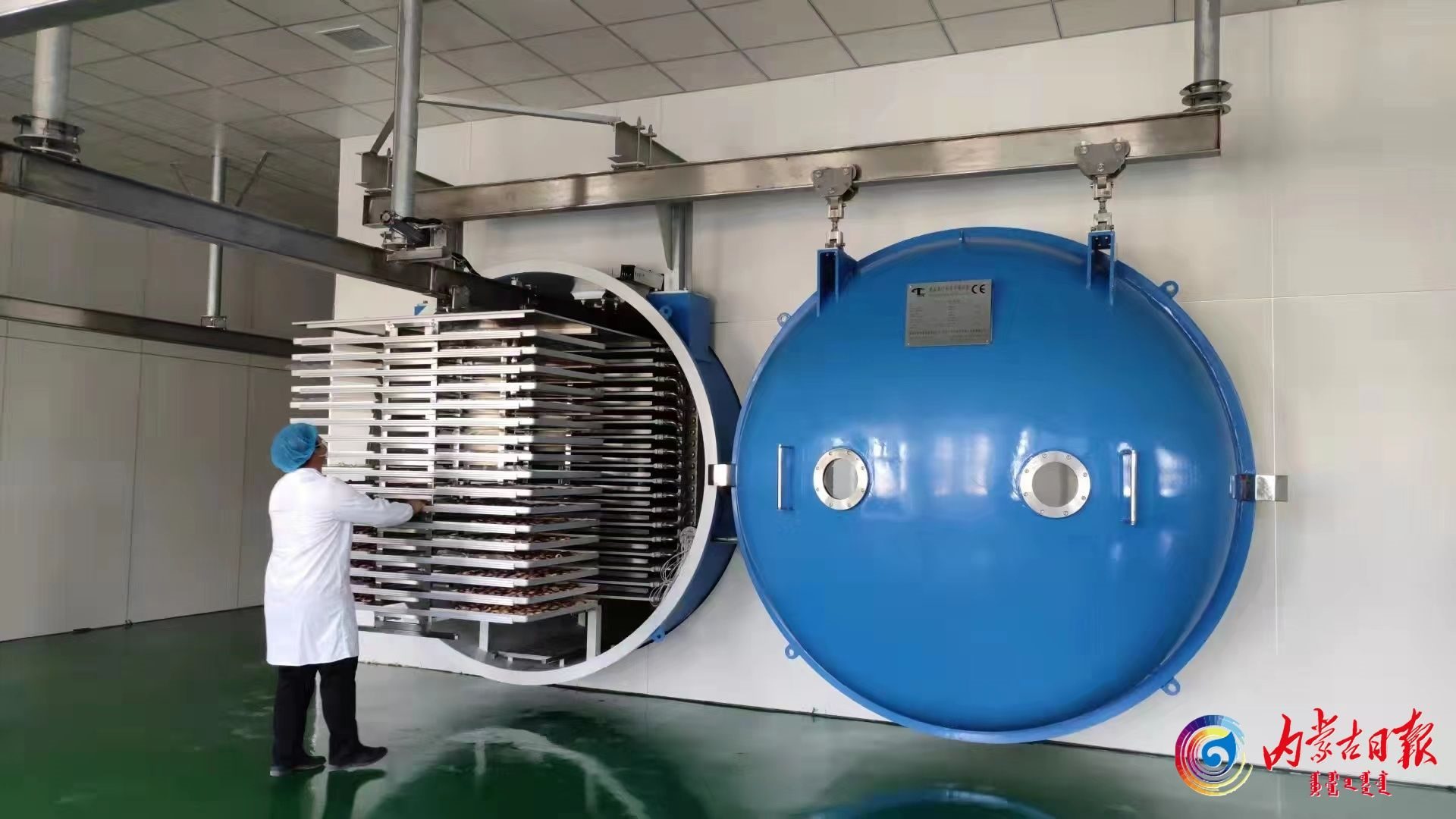 蒙果鮮食品有限公司員工將鮮果片裝入真空干燥倉(cāng)進(jìn)行凍干處理。