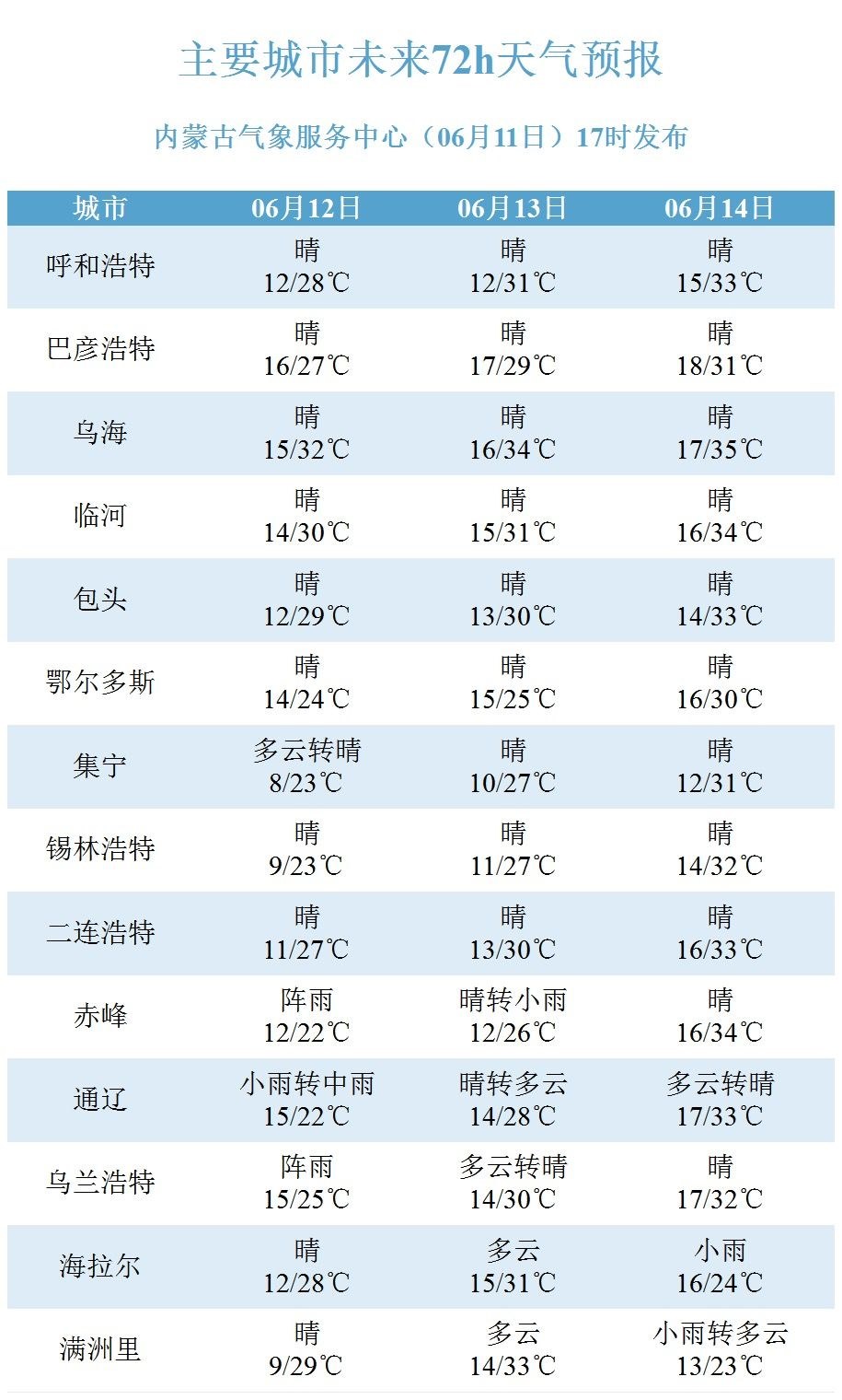 具體天氣預(yù)報為:12日白天到夜間,內(nèi)蒙古中部偏東和東部大部地區(qū)多云,其中,錫林郭勒盟東部、赤峰市、通遼市、興安盟大部、呼倫貝爾市南部部分地區(qū)有小雨或雷陣雨,上述地區(qū)可能伴有短時強降水、雷暴大風(fēng)等強對流天氣,其余地區(qū)晴間多云;內(nèi)蒙古西部偏西和中部偏東地區(qū)4~5級東南風(fēng)或偏北風(fēng);阿拉善盟西北部局地有35℃以上的高溫天氣。