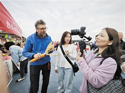 在包頭市婦聯(lián)巾幗好品展示區(qū),當?shù)貗D女的手工編織品非常受關(guān)注,大家紛紛駐足了解玉米皮工藝品、坐墊、手提筐等?!斑@幅畫非常漂亮,是用玉米皮做成的?!眮碜杂摹熬W(wǎng)紅”博主李·巴雷特認真聽了介紹,并錄制了短視頻。現(xiàn)場,熱情的村民紛紛與外國友人打招呼、聊天、合影留念。