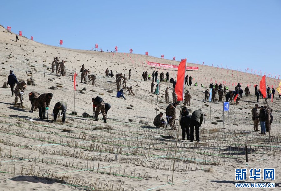 ??參會(huì)人員與專業(yè)技術(shù)服務(wù)隊(duì)以及社會(huì)各界代表,在渾善達(dá)克沙地設(shè)置沙障。新華網(wǎng) 石毅攝