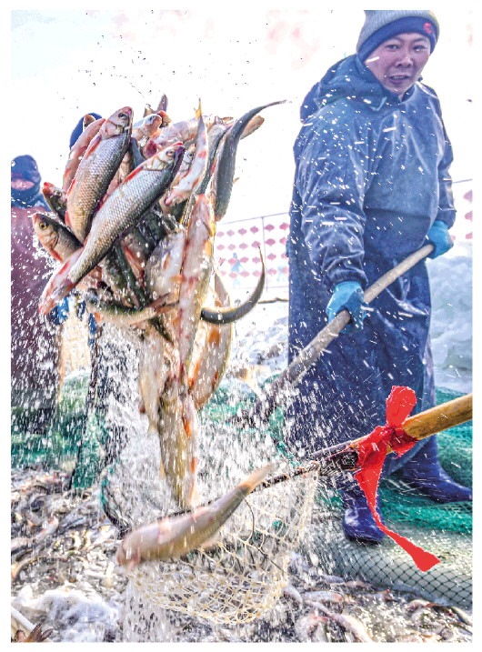 ▲1月13日,達(dá)里湖漁場(chǎng)的工作人員在撈魚裝箱。日前,內(nèi)蒙古達(dá)里湖冬捕旅游季在赤峰市克什克騰旗拉開帷幕。此次活動(dòng)包括祭湖儀式、開湖捕魚、文藝展演等多個(gè)項(xiàng)目,吸引眾多游人前來觀看。新華社記者彭源攝
