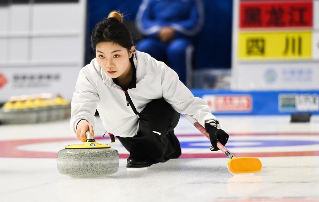 1月17日,四川隊(duì)選手崔欣然在第十四屆全國冬季運(yùn)動會冰壺青年組比賽中擲壺。新華社記者 劉磊 攝