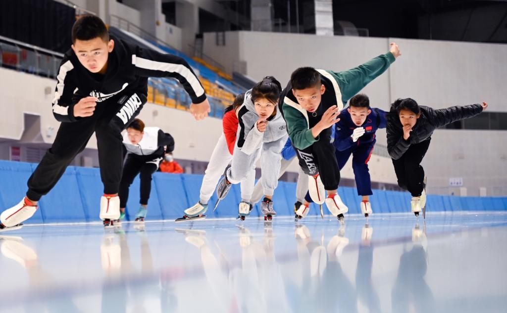??呼倫貝爾學(xué)院冰雪運(yùn)動(dòng)專業(yè)學(xué)生正在進(jìn)行滑冰訓(xùn)練。新華社記者 賀書琛 攝