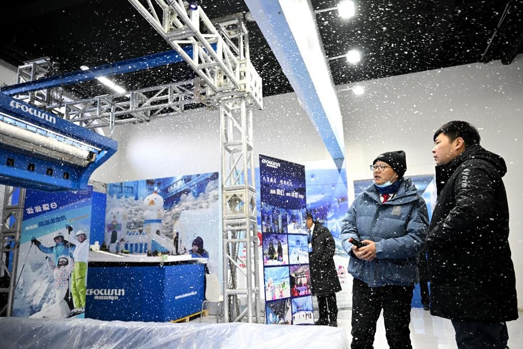 ??2023年12月16日,市民在展銷會(huì)上觀看飄雪機(jī)飄雪。當(dāng)日,2023年首屆呼倫貝爾·海拉爾冰雪產(chǎn)品冬季展銷會(huì)在內(nèi)蒙古呼倫貝爾市海拉爾區(qū)開幕。新華社記者 貝赫 攝