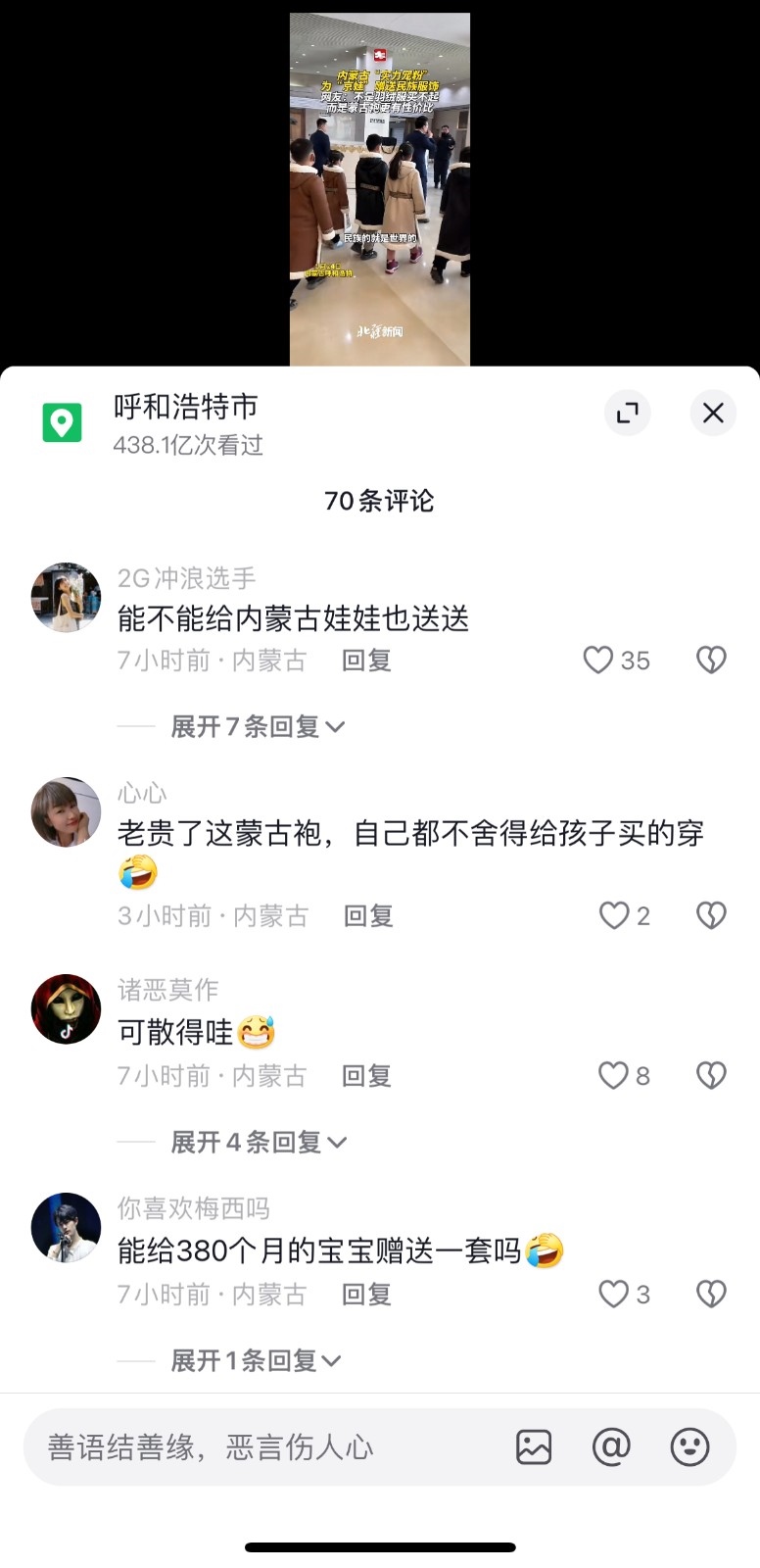 內(nèi)蒙古為了招待北京來(lái)的萌娃們,直接送了溫暖的蒙古袍,對(duì)于這些,本地人的反應(yīng)是:“能不能給內(nèi)蒙古娃娃也送送”“能給380個(gè)月的寶寶贈(zèng)送一套嗎”。還有本地人表示,“蒙古袍子就送了”“老貴了這蒙古袍,自己都不舍得給孩子買的穿”。