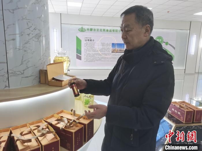 圖為范文宏為記者展示他的黃芪產(chǎn)品。李愛平攝