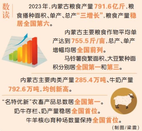 五谷者,萬民之命,國(guó)之重寶。2023年,內(nèi)蒙古以糧食產(chǎn)量791.6億斤迎來了第二十個(gè)豐收年。糧食播種面積、單產(chǎn)、總產(chǎn)“三增長(zhǎng)”,糧食產(chǎn)量穩(wěn)居全國(guó)第六。全區(qū)主要肉類產(chǎn)量285.4萬噸、牛奶產(chǎn)量792.6萬噸,均創(chuàng)新高?!懊貎?yōu)新”農(nóng)畜產(chǎn)品總數(shù)居全國(guó)第一,“內(nèi)蒙古味道”香飄萬里。