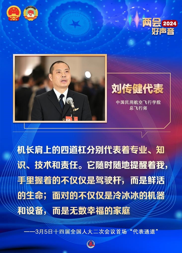 劉傳健說:“機長肩上的四道杠分別代表著專業(yè)、知識、技術(shù)和責任。它隨時隨地提醒著我,手里握著的不僅僅是駕駛桿,而是鮮活的生命;面對的不僅僅是冷冰冰的機器和設(shè)備,而是無數(shù)幸福的家庭?!?/p>