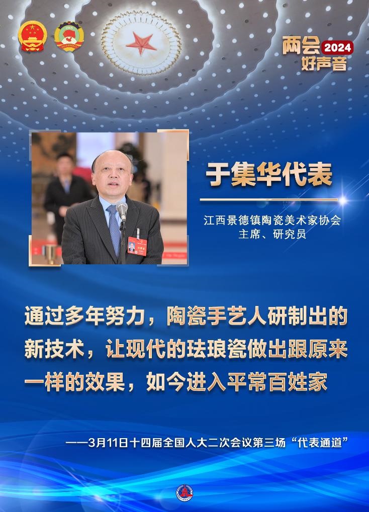 江西景德鎮(zhèn)陶瓷美術(shù)家協(xié)會(huì)主席、研究員于集華代表說,通過多年努力,陶瓷手藝人研制出的新技術(shù),讓現(xiàn)代的琺瑯瓷做出跟原來一樣的效果,如今進(jìn)入平常百姓家。