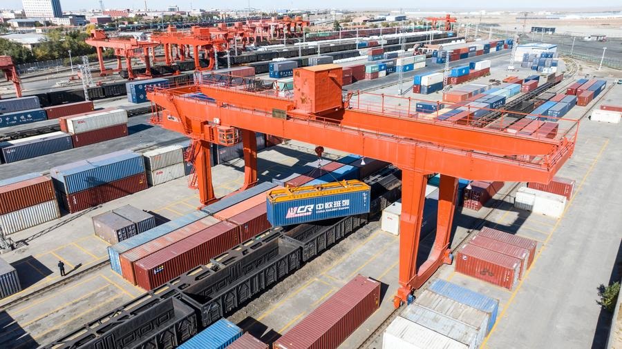 ??這是2023年10月18日在二連浩特鐵路口岸拍攝的中歐班列貨運吊裝作業(yè)現(xiàn)場。新華社發(fā)(郭鵬杰 攝)