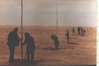 ??“領(lǐng)導(dǎo)都帶頭干,王占文書記包的我們奮勇大隊(duì),帶我們種沙柳。全大隊(duì)11個(gè)生產(chǎn)隊(duì),排著隊(duì)、唱著歌,把紅旗插在各自的沙梁上。民兵也領(lǐng)著娃娃們來種樹,他們掏坑,娃娃遞樹栽子。幾年下來,把奮勇大隊(duì)種成了自治區(qū)最早的萬畝林大隊(duì)。馮耀華當(dāng)時(shí)是公社副書記,包的是阿魯柴登,郭巨才當(dāng)時(shí)是公社副主任,包了什里加汗。王占文還專門組織了測繪隊(duì),繪出地圖,統(tǒng)一規(guī)劃,給所有農(nóng)田種上防護(hù)林,定下在哪修路種上行道樹。20年后按圖修路時(shí),施工隊(duì)發(fā)現(xiàn),路基兩旁的樹早種好了?!卑兹龑毣貞洝?/p>