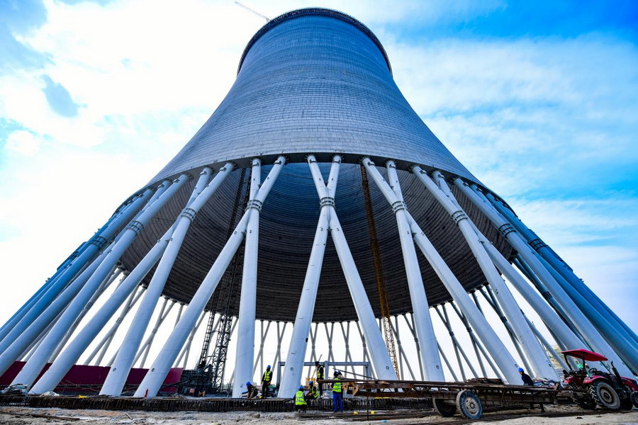 12月6日,在內(nèi)蒙古呼和浩特市土默特左旗內(nèi)蒙古能源集團(tuán)金山熱電三期項(xiàng)目建設(shè)現(xiàn)場(chǎng),工人們正有序進(jìn)行著設(shè)備安裝等工作。進(jìn)入該項(xiàng)目間冷塔內(nèi)部,抬頭仰望,仿佛一只巨大的眼睛凝視,未來該項(xiàng)目投產(chǎn)后可實(shí)現(xiàn)年發(fā)電量100億千瓦時(shí),新增供熱面積5000萬平方米,將溫暖送至千家萬戶。(楊鑫 攝)