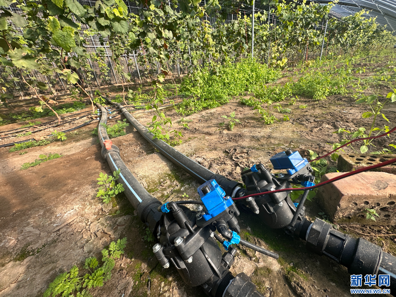 ??包頭市東河區(qū)沙爾沁一村果路農(nóng)業(yè)葡萄種植基地溫室里,通過管道輸送葡萄樹苗所需營養(yǎng)成份。新華網(wǎng)發(fā)(張建芳 攝)