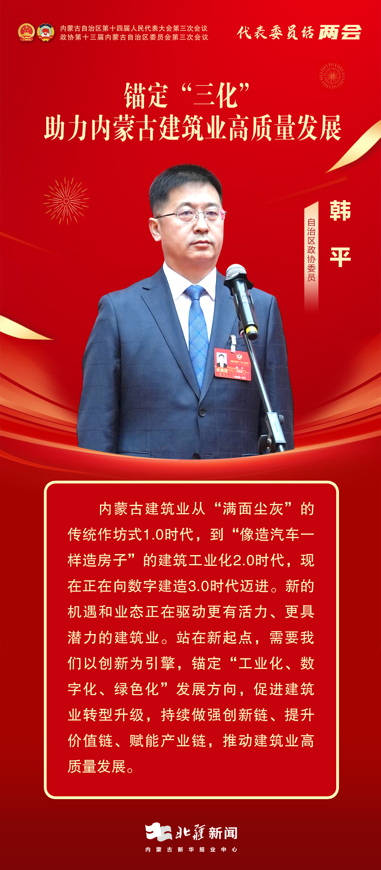 北疆新聞呼和浩特1月13日電(記者 張鑫 李姝廷)委員通道,通民心、道發(fā)展。1月13日上午,自治區(qū)兩會首場“委員通道”正式開啟。自治區(qū)政協(xié)委員,興泰建設集團有限公司黨委書記、董事長韓平圍繞“建筑業(yè)高質(zhì)量發(fā)展”的內(nèi)容建真言、獻良策。