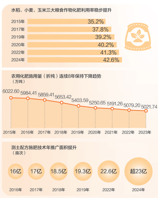 2024年,我國水稻、小麥、玉米三大糧食作物化肥利用率為42.6%,比2022年提高1.3個百分點?;世寐?,即化肥被作物吸收利用的比例,反映了化肥在農(nóng)業(yè)生產(chǎn)中的有效利用程度。科學施肥效果提升,折射農(nóng)業(yè)發(fā)展方式之變。