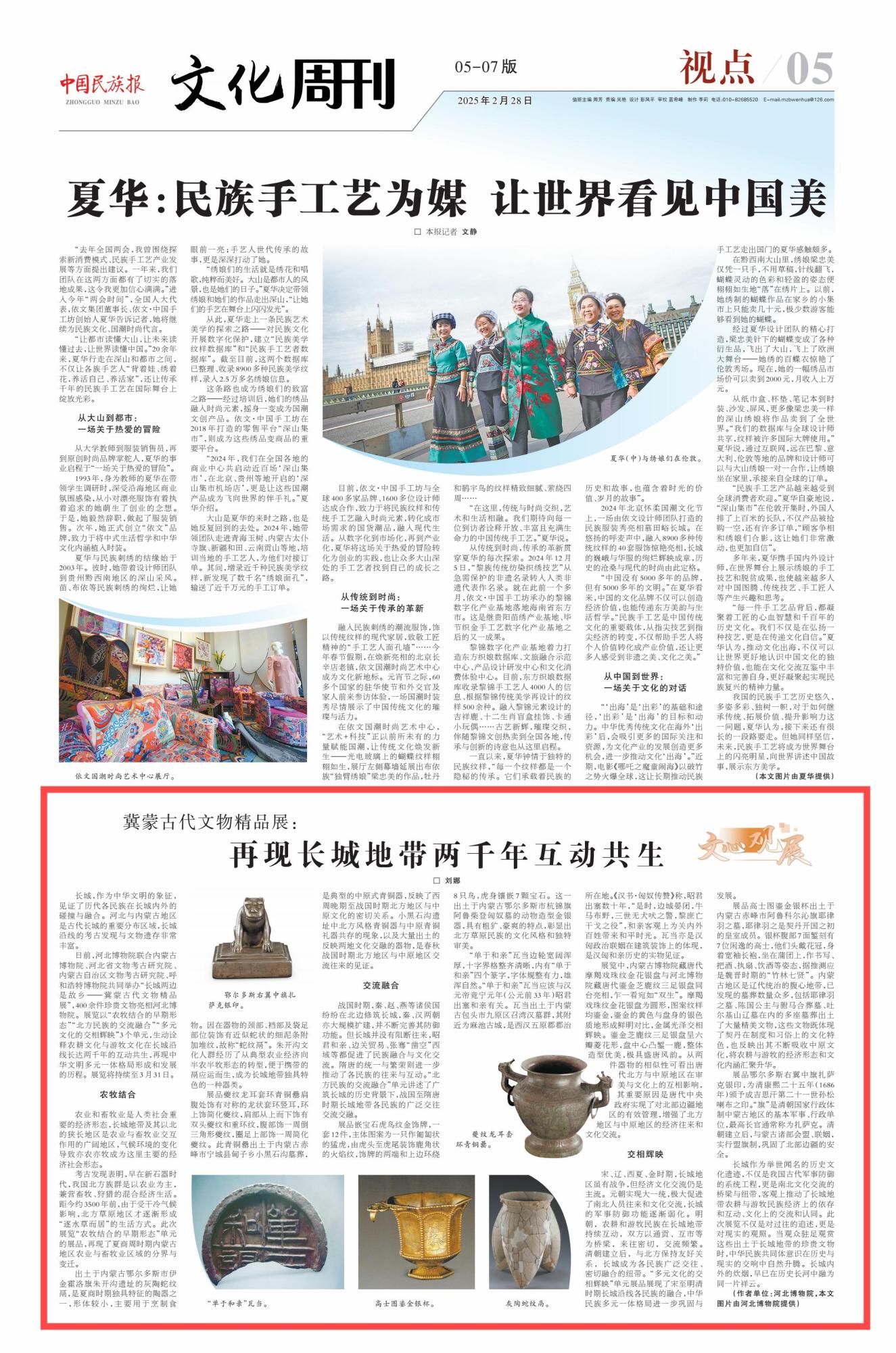 2025年2月28日,《中國民族報(bào)》第5版刊發(fā)題為《冀蒙古代文物精品展:再現(xiàn)長(zhǎng)城地帶兩千年互動(dòng)共生》的文章,報(bào)道了河北博物院聯(lián)合內(nèi)蒙古博物院、河北省文物考古研究院、內(nèi)蒙古自治區(qū)文物考古研究院、呼和浩特博物院共同舉辦“長(zhǎng)城兩邊是故鄉(xiāng)——冀蒙古代文物精品展”,400余件珍貴文物亮相河北博物院。