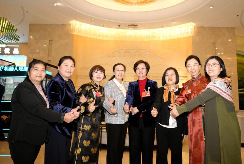 3月7日,參加十四屆全國(guó)人大三次會(huì)議的內(nèi)蒙古代表團(tuán)的部分女代表們?cè)隈v地合影,迎接即將到來的三八婦女節(jié),表達(dá)了對(duì)全國(guó)女性的美好祝愿。記者 馬建兵 攝
