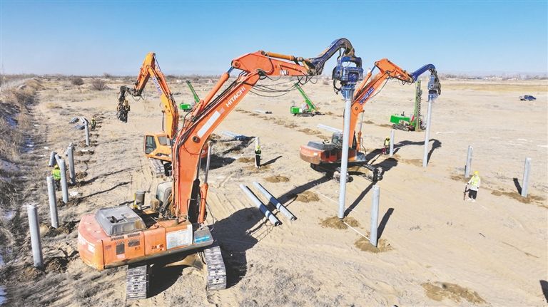 引孔機(jī)、打樁機(jī)轟鳴聲不絕于耳,打樁機(jī)將一根根水泥樁“釘”入地面中……連日來,巴彥淖爾市臨河區(qū)新華林場防沙治沙和光伏一體化項(xiàng)目施工現(xiàn)場多臺作業(yè)車輛同時進(jìn)行樁基作業(yè),現(xiàn)場還不時有工作人員對打樁等基礎(chǔ)工作進(jìn)行抽檢抽查,確保施工質(zhì)量。