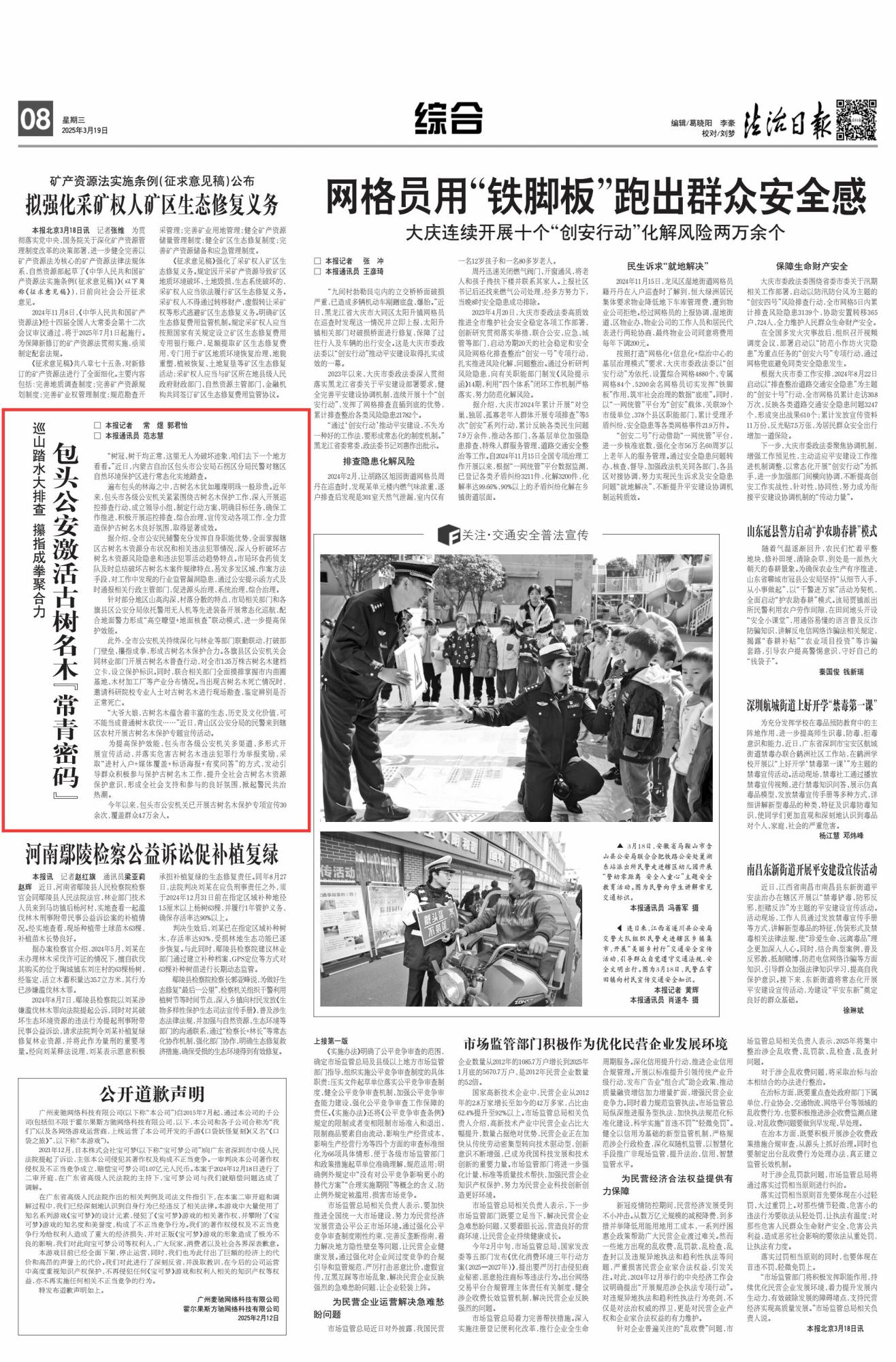 2025年3月19日,《法治日報》第8版刊發(fā)題為《巡山踏水大排查 攥指成拳聚合力 包頭公安激活古樹名木“常青密碼”》的文章,報道了近年來,包頭市各級公安機關(guān)緊緊圍繞古樹名木保護(hù)工作,深入開展巡控排查行動,成立領(lǐng)導(dǎo)小組、制定行動方案、明確目標(biāo)任務(wù)、確保工作推進(jìn),積極開展巡控排查、綜合治理、宣傳發(fā)動各項工作,全力營造保護(hù)古樹名木良好氛圍,取得顯著成效。