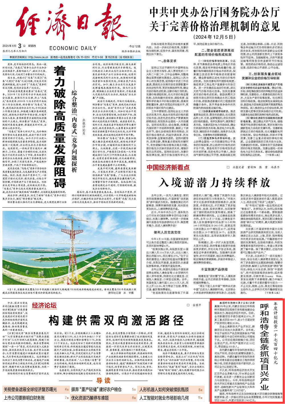 2025年4月3日,《經(jīng)濟(jì)日報(bào)》第1版刊發(fā)題為《年度計(jì)劃投資一千七百四十億元 呼和浩特全鏈條抓項(xiàng)目興產(chǎn)業(yè)》的文章,報(bào)道了今年以來,內(nèi)蒙古自治區(qū)呼和浩特市圍繞項(xiàng)目招商引資和落地建設(shè)全鏈條發(fā)力,推動經(jīng)濟(jì)回升向好。