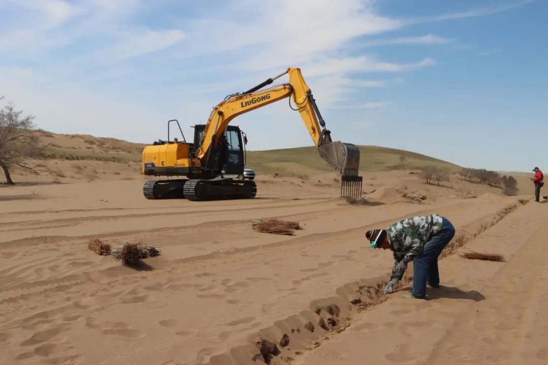 據(jù)錫林浩特市二蛋牧民養(yǎng)殖專業(yè)合作社負(fù)責(zé)人介紹,在傳統(tǒng)的沙漠治理作業(yè)中,工人需要手動栽植黃柳等固沙植物。然而,人工種植不僅效率低,勞動強度也大。為突破這一困境,合作社成員經(jīng)過多次試驗,最終決定對挖掘機進行創(chuàng)新改造,加裝叉具,這一巧妙的設(shè)計不僅實現(xiàn)了對黃柳種植深度和間距的精準(zhǔn)把控,還能有效避免土壤翻動,最大程度地保持了土壤水分,切實保護了沙地的生態(tài)環(huán)境?! ?/p>
