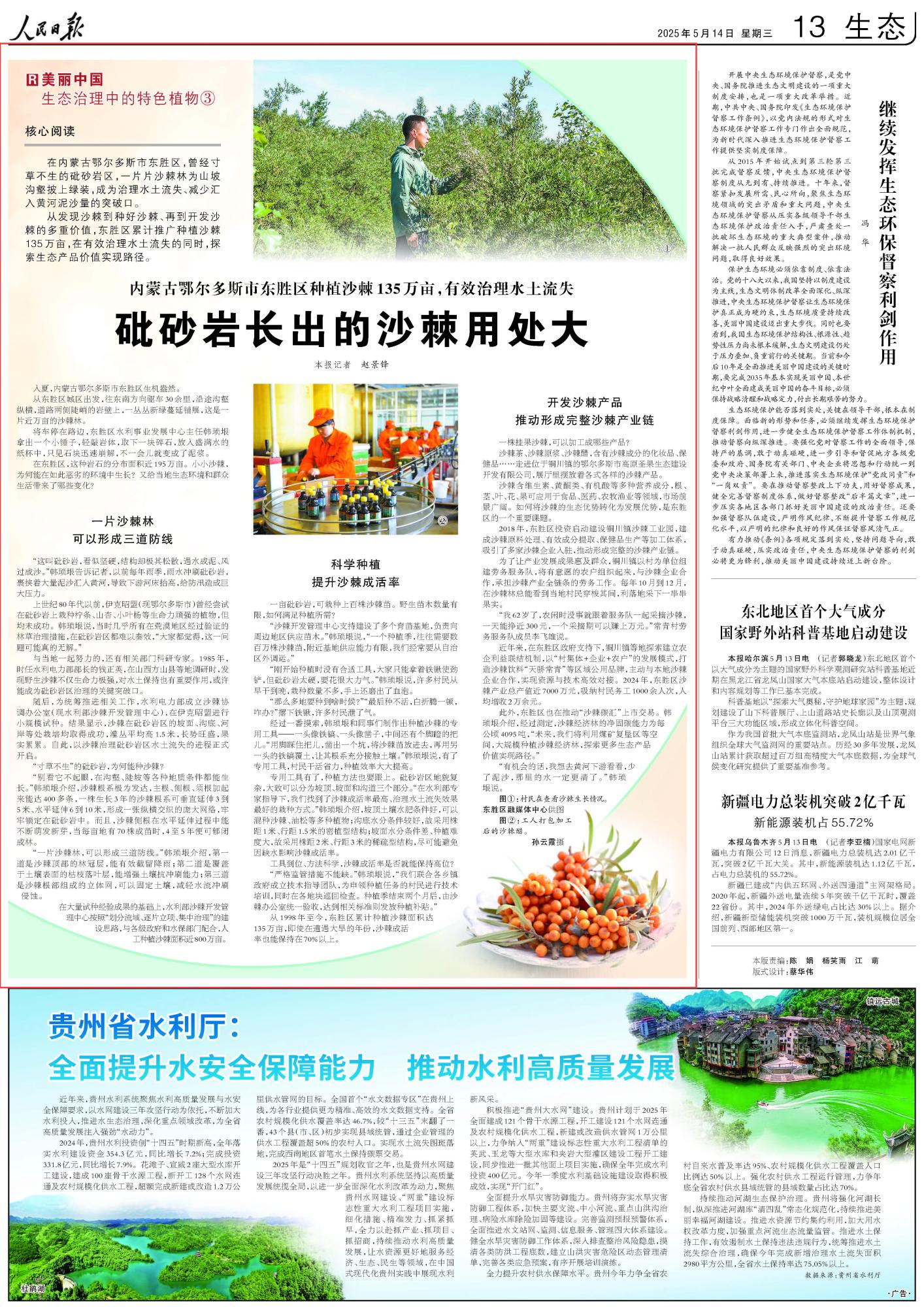 2025年5月14日《人民日?qǐng)?bào)》第13版刊發(fā)了《內(nèi)蒙古鄂爾多斯市東勝區(qū)種植沙棘135萬畝,有效治理水土流失 砒砂巖長出的沙棘用處大》的文章,報(bào)道了內(nèi)蒙古鄂爾多斯市東勝區(qū)累計(jì)推廣種植沙棘135萬畝,在有效治理水土流失的同時(shí),探索生態(tài)產(chǎn)品價(jià)值實(shí)現(xiàn)路徑。