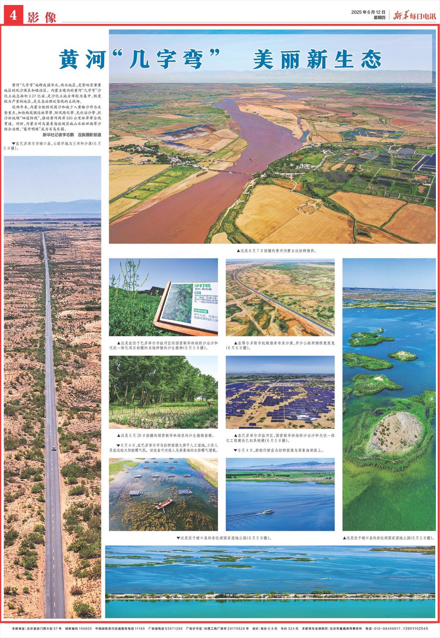 2025年6月12日,《新華每日電訊》第4版刊發(fā)題為《黃河“幾字彎” 美麗新生態(tài)》一文,報(bào)道了黃河“幾字彎”地跨我國華北、西北地區(qū),是影響京津冀地區(qū)的風(fēng)沙源區(qū)和路徑區(qū)。內(nèi)蒙古加快構(gòu)筑鎖邊林草帶、防風(fēng)綠化帶、光伏治沙帶、攔沙淤地壩“四道防線”,推動(dòng)黃河兩岸620公里林草帶全線貫通。