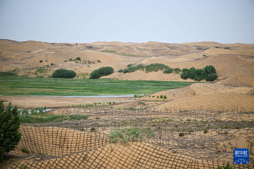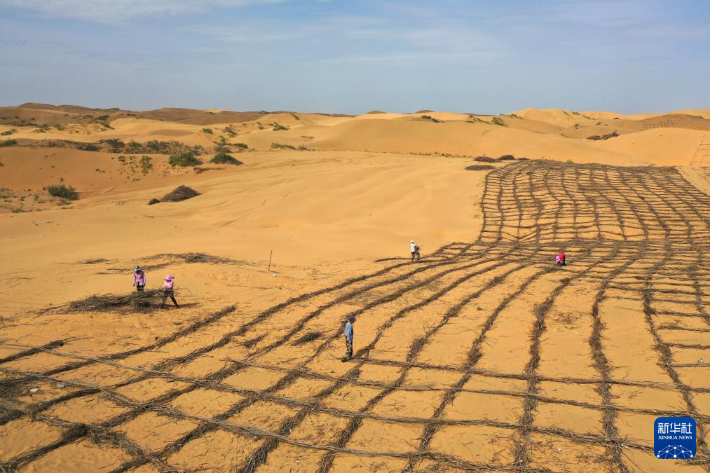6月7日,在鄂爾多斯市達(dá)拉特旗境內(nèi)的庫布其沙漠,工人在治沙 新華社記者 李志鵬 攝