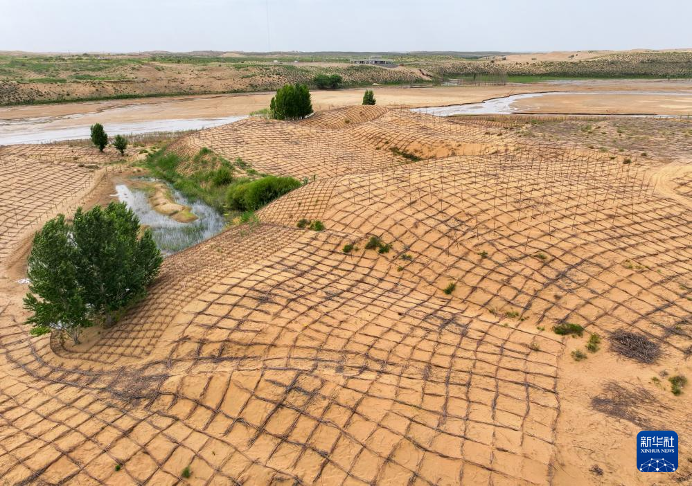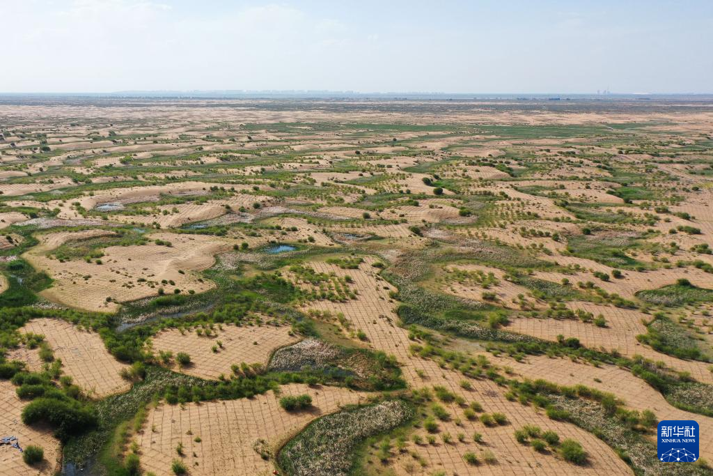6月7日,在鄂爾多斯市達(dá)拉特旗境內(nèi)的庫布其沙漠,工人在治沙(無人機(jī)照片)新華社記者 李志鵬 攝