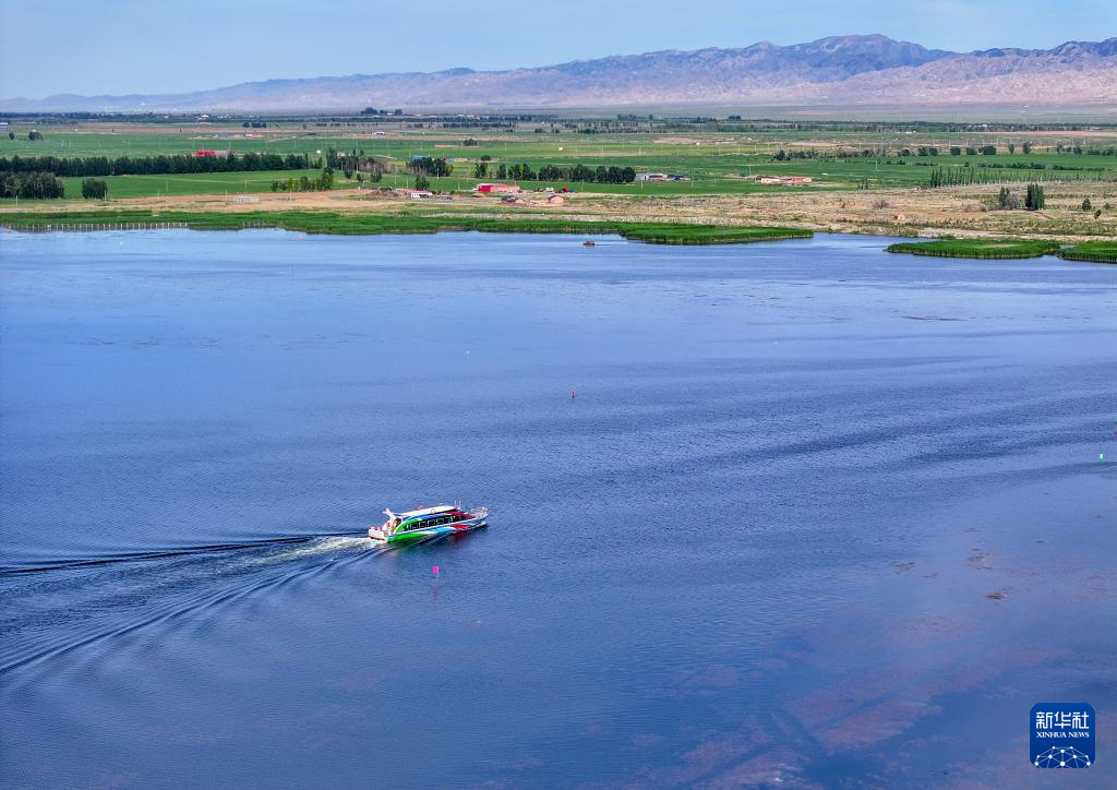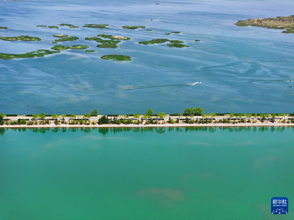 6月5日,在巴彥淖爾市磴口縣奈倫湖國家濕地公園,摩托艇行駛在湖面上(無人機(jī)照片)新華社記者 李志鵬 攝