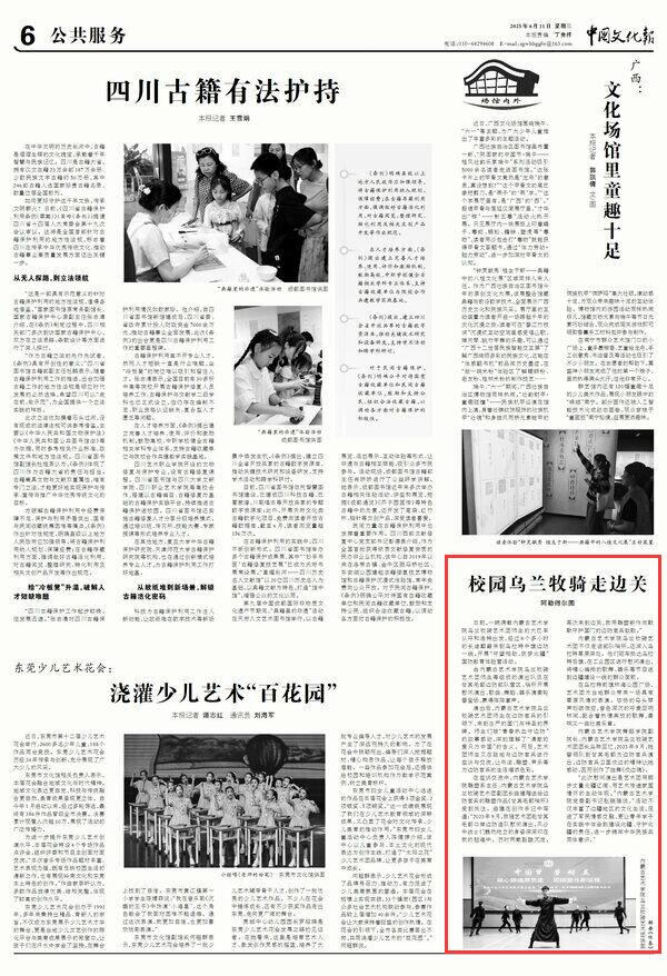 2025年6月11日,《中國(guó)文化報(bào)》第6版刊發(fā)題為《校園烏蘭牧騎走邊關(guān)》的文章,報(bào)道了內(nèi)蒙古藝術(shù)學(xué)院烏蘭牧騎藝術(shù)團(tuán)師生來到烏拉特中旗邊防一線,開展慰問演出,歌曲、舞蹈、器樂演奏輪番登場(chǎng),贏得陣陣掌聲。