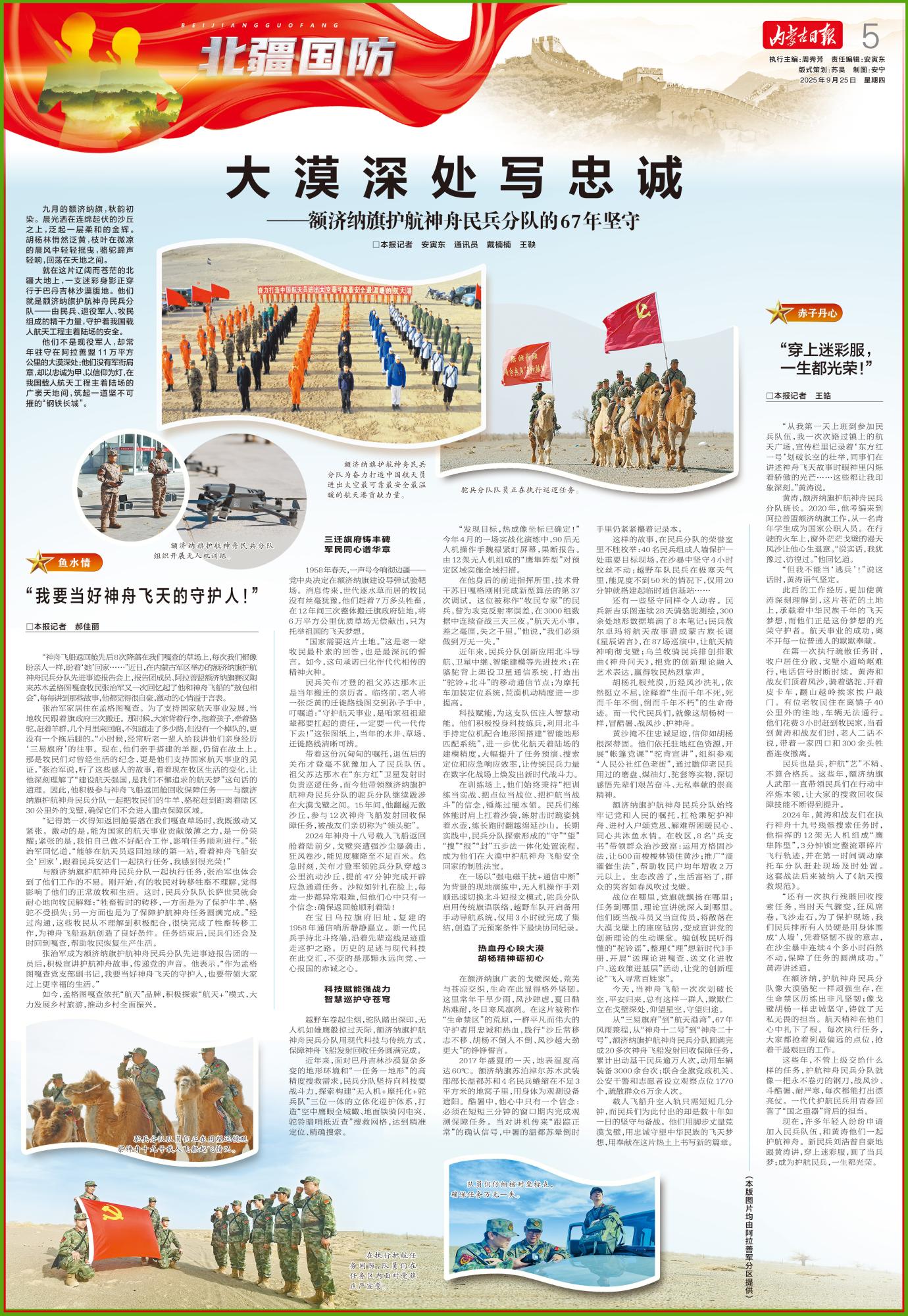 就在這片遼闊而蒼茫的北疆大地上,一支迷彩身影正穿行于巴丹吉林沙漠腹地。他們就是額濟納旗護航神舟民兵分隊——由民兵、退役軍人、牧民組成的精干力量,守護著我國載人航天工程主著陸場的安全。