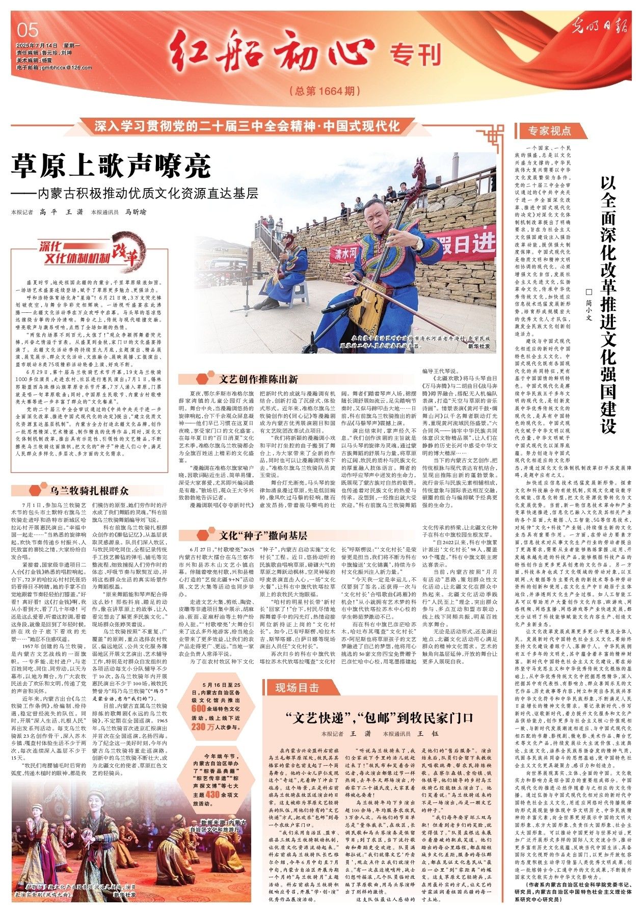 2025年7月14日,《光明日報》第5版刊發(fā)題為《草原上歌聲嘹亮——內(nèi)蒙古積極推動優(yōu)質(zhì)文化資源直達基層》的文章,報道了盛夏時節(jié),地處祖國北疆的內(nèi)蒙古,千里草原綠浪如茵。一場場藝術(shù)盛宴連續(xù)登場,賦予了草原更多魅力、更強活力。