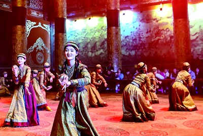 在鄂爾多斯文化產(chǎn)業(yè)園景區(qū)沉浸式劇場,演員表演實景劇《鳳鳴九曲》。新華社發(fā)
