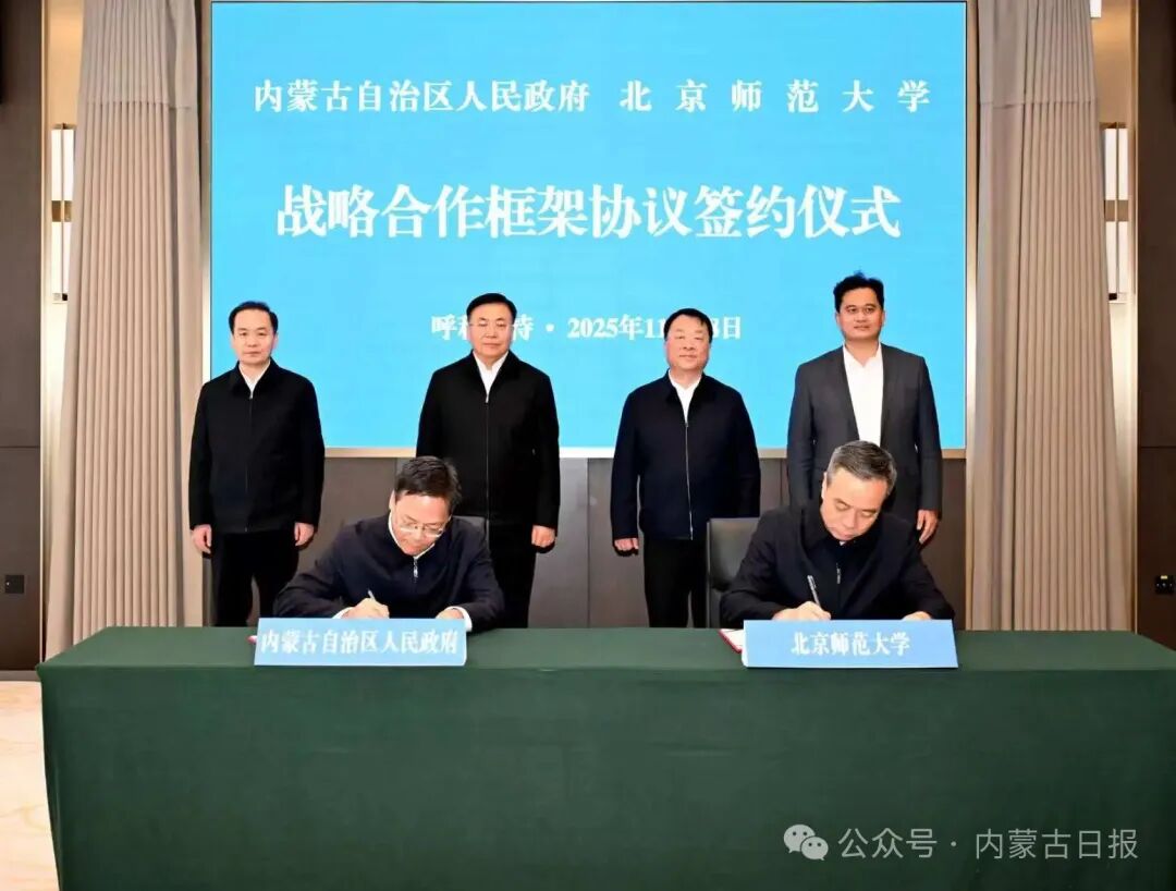 11月18日,自治區(qū)黨委副書記、自治區(qū)人民政府主席包鋼與北京師范大學黨委書記程建平共同見證自治區(qū)人民政府與北京師范大學簽署戰(zhàn)略合作框架協(xié)議。草原云·內蒙古新聞網記者 韓卿立 攝