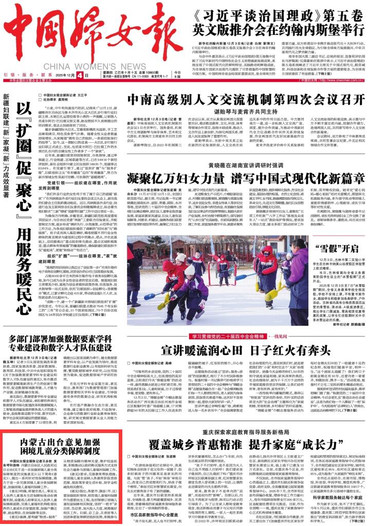 2025年12月4日《中國(guó)婦女報(bào)》第1版刊發(fā)了《內(nèi)蒙古出臺(tái)意見(jiàn)加強(qiáng)困境兒童分類保障制度》的文章,報(bào)道了內(nèi)蒙古自治區(qū)人民政府近日出臺(tái)《關(guān)于進(jìn)一步加強(qiáng)困境兒童分類保障制度的實(shí)施意見(jiàn)》,提出一系列針對(duì)性保障措施,致力于進(jìn)一步完善困境兒童分類保障制度,加強(qiáng)困境兒童福利保障工作。