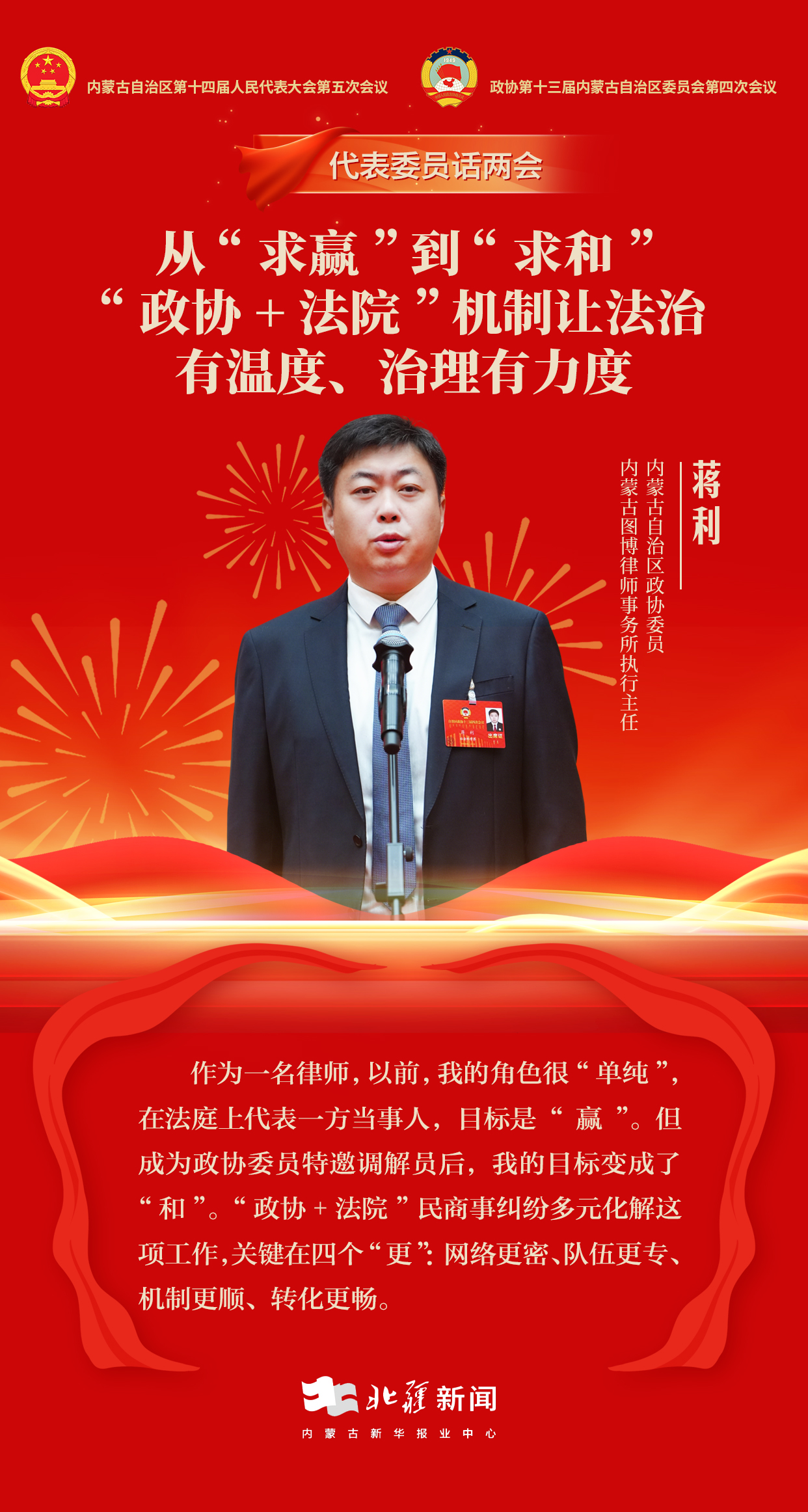 北疆新聞呼和浩特2月3日消息(記者 張鑫 楊凈毓 李文華)“作為一名律師,以前,我的角色很‘單純’,在法庭上代表一方當事人,目標是‘贏’。但成為政協(xié)委員特邀調(diào)解員后,我的目標變成了‘和’?!弊灾螀^(qū)政協(xié)委員、內(nèi)蒙古圖博律師事務所執(zhí)行主任蔣利說。