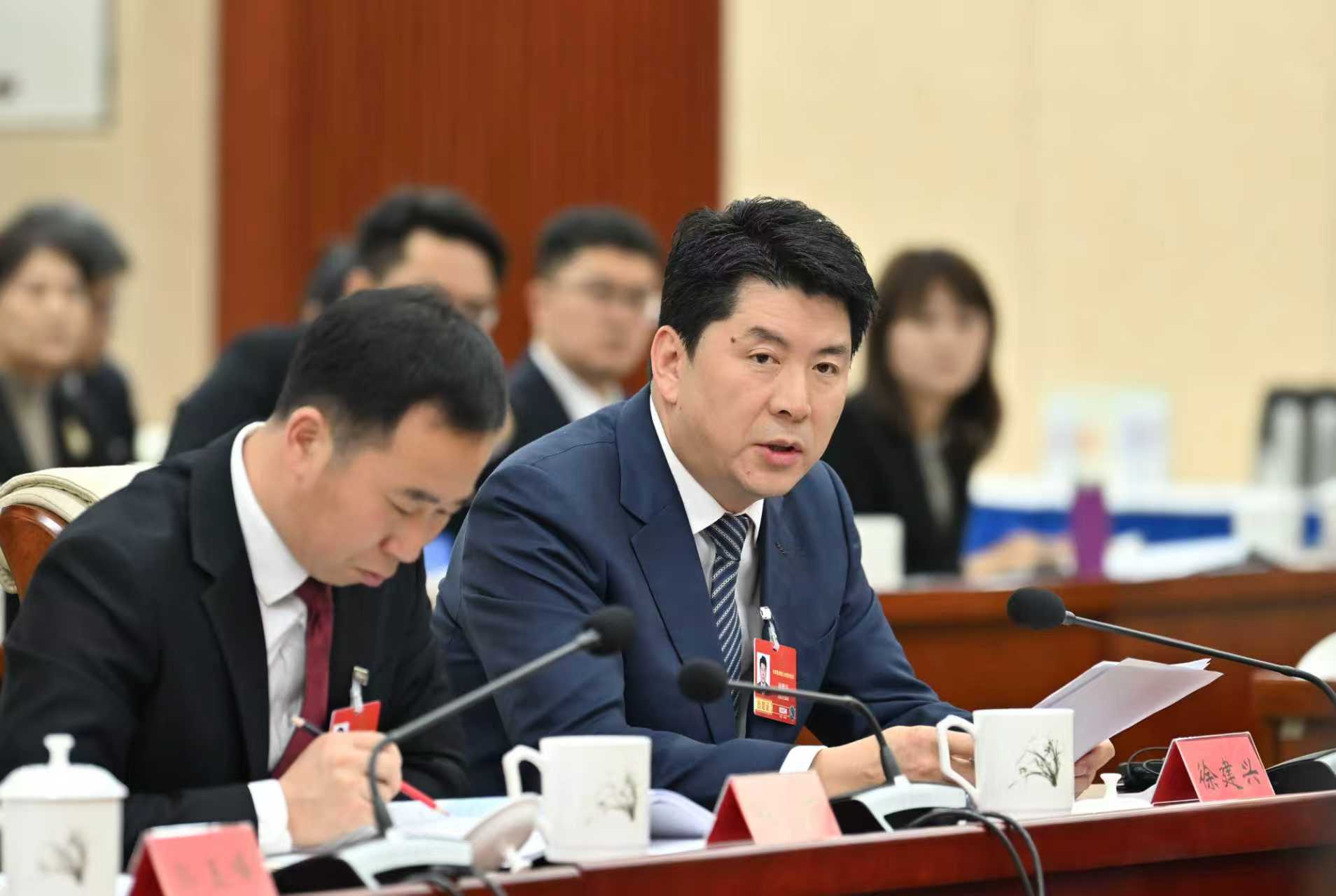 3月5日,全國人大代表徐建興(右一)建議加大對農(nóng)業(yè)企業(yè)科技創(chuàng)新的扶持力度,鼓勵企業(yè)與科研院所、高校合作,開展品種改良、精深加工等技術(shù)攻關(guān)。草原云記者 馬建兵 攝
