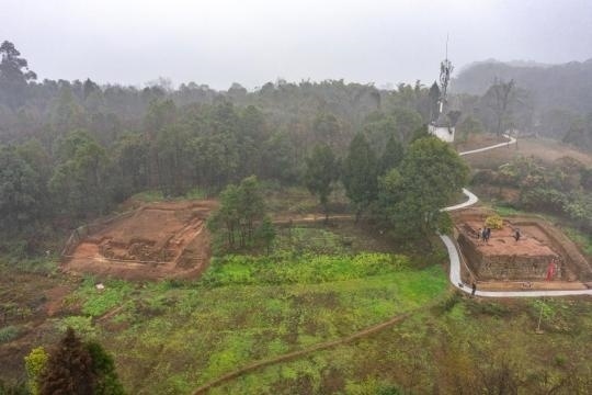 這是2月9日在重慶合川釣魚城遺址拍攝的新發(fā)掘出的類似闕臺(tái)建筑的基址(無(wú)人機(jī)照片)。新華社記者 黃偉 攝
