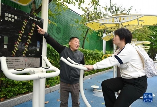 4月24日,西河智慧體育公園工作人員(左)向晨練的市民介紹具備對(duì)運(yùn)動(dòng)數(shù)據(jù)進(jìn)行采集、分析等多項(xiàng)功能的智能競(jìng)賽健身車。