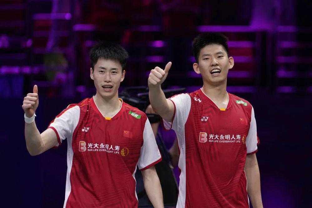 5月20日,中國(guó)隊(duì)組合劉雨辰/歐烜屹(右)在男雙比賽后慶祝。