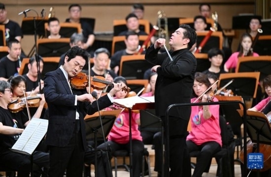 5月25日,在天津大劇院音樂廳,小提琴演奏家呂思清(左)和指揮李飚(右)在舞臺上演出。