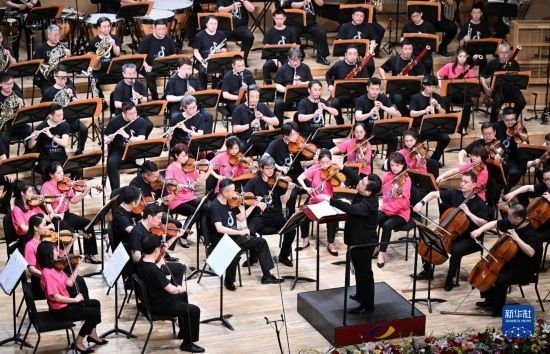 5月25日,在天津大劇院音樂廳,由天津歌舞劇院、天津交響樂團等組成的天津百人聯(lián)合樂團在舞臺上演奏。