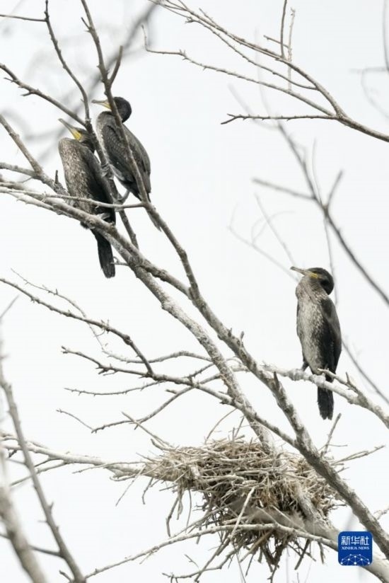 準(zhǔn)備學(xué)習(xí)飛翔的幾只鸕鶿幼鳥(niǎo)棲息在密云水庫(kù)“鳥(niǎo)島”的樹(shù)上(5月31日攝)。