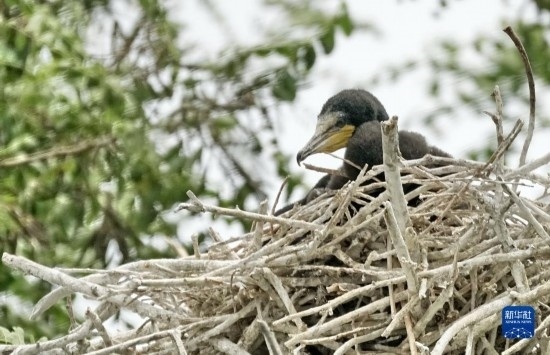 密云水庫(kù)“鳥(niǎo)島”上一只鸕鶿幼鳥(niǎo)在窩中休息(5月31日攝)。
