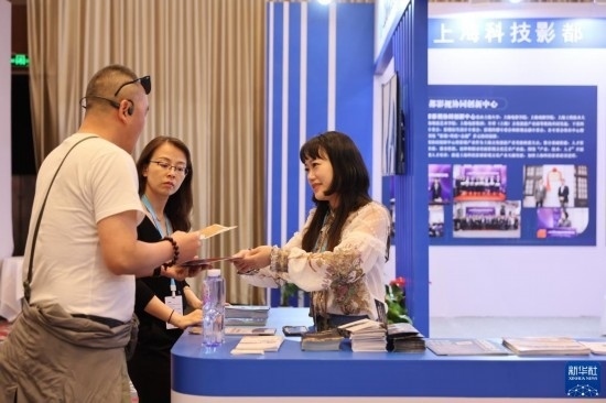 6月10日,展商在電影市場(chǎng)與咨詢者交換聯(lián)系方式。