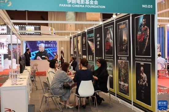 6月10日,咨詢者在第25屆上海國(guó)際電影節(jié)電影市場(chǎng)伊朗電影基金會(huì)展區(qū)與展商溝通。